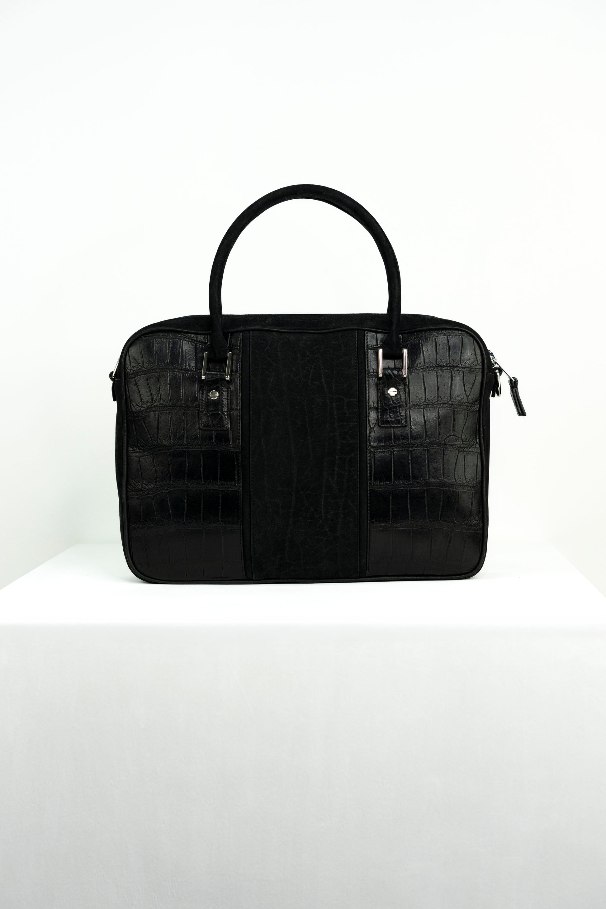 The pinnacle of monochromatic design, this laptop bag is a study in texture. By pairing the velvety, matte finish of premium black Nubuck with the bold, high-shine scales of genuine crocodile leather, we've created a piece that is both discreet and undeniably luxurious. Engineered for the modern professional who demands a sharp, "all-black" aesthetic without sacrificing artisanal quality.