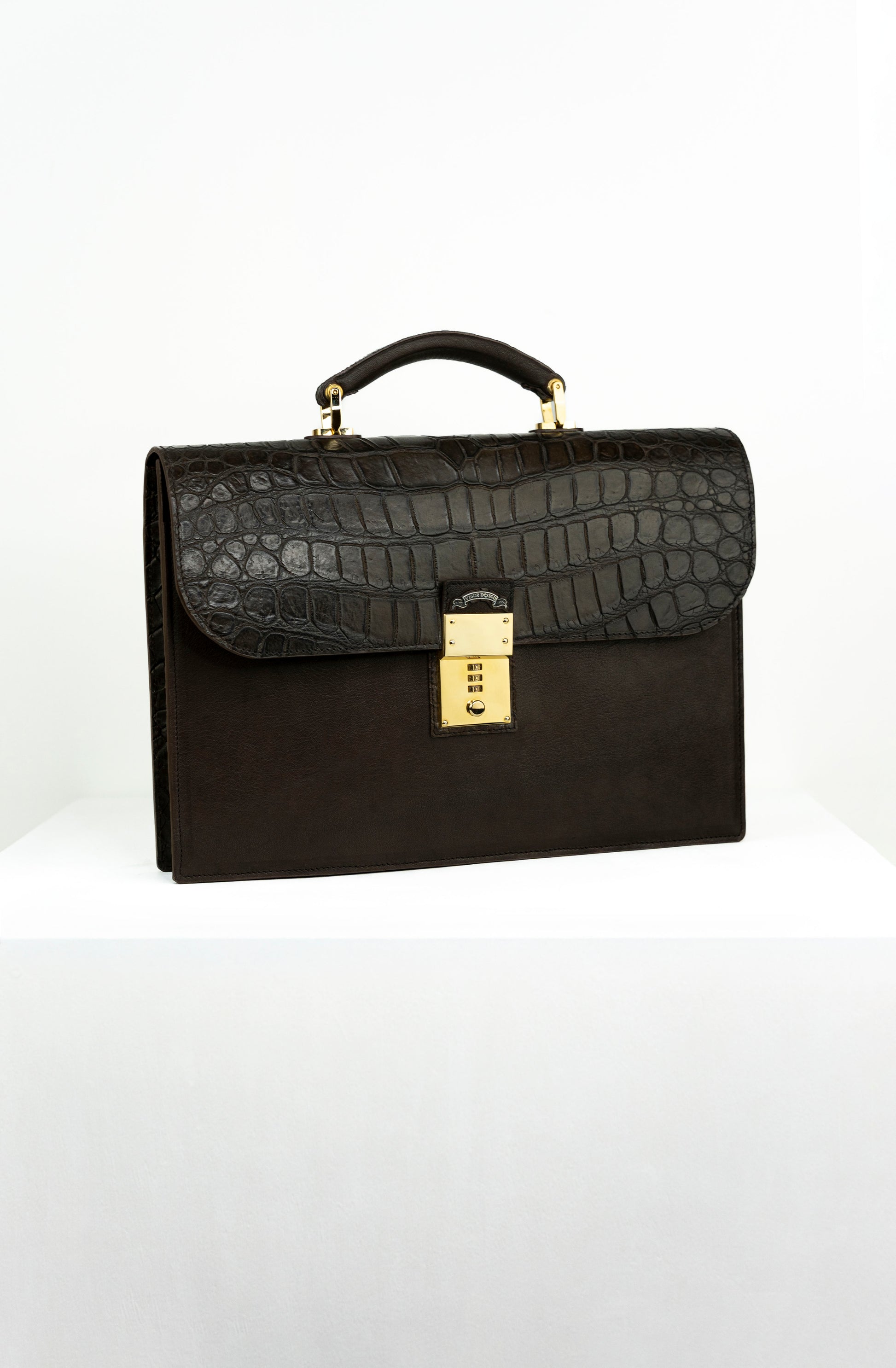 A masterclass in texture and tone, this briefcase pairs the buttery smoothness of premium Nappa leather with a bold, genuine crocodile leather flap. The deep chocolate hue is perfectly complemented by polished gold-tone hardware, creating a professional accessory that exudes confidence and refined taste.